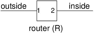El firewall suele ser un enrutador especializado que actúa como puerta de enlace entre la red local y las redes externas, es decir, todo el tráfico pasa por el firewall. En la imagen se ilustra la vista de un enrutador, R , con un firewall, donde una interfaz está conectada a la red externa y la otra a la red interna.
