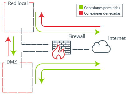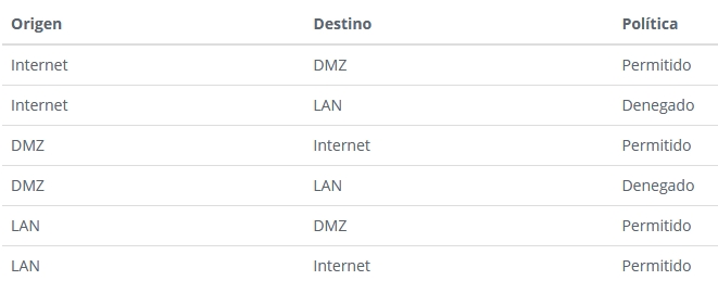 Para configurar una zona desmilitarizada en la red de la organización, es necesario el firewall que será el encargado de segmentar la red y permitir o denegar las conexiones. En la siguiente tabla, de manera somera, se muestra el tipo de conexiones recomendables que permitiría o denegaría el firewall dependiendo su origen y destino: